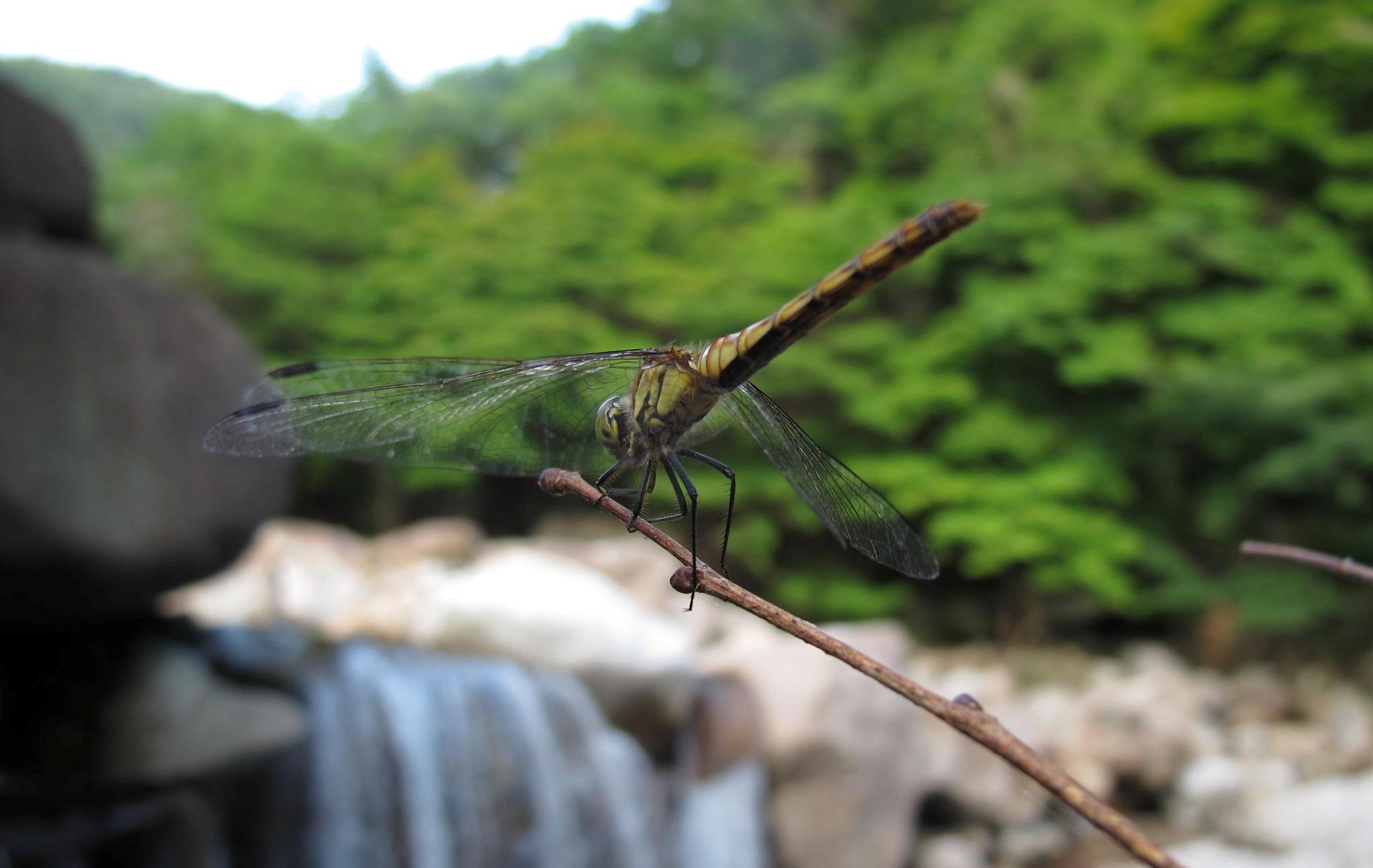 A dragonfly sat on the end of a persimmon branch